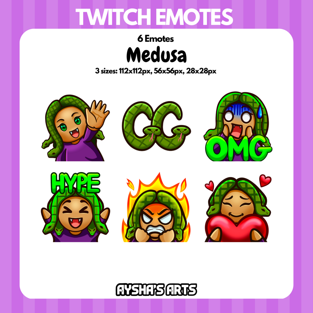 Add a cute little Gorgon to your Twitch and Discord with these emotes hand drawn by me!😊🐍